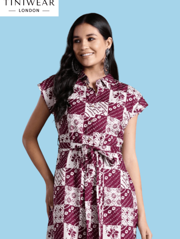 Shirt Dress with Belt - Maroon & White
