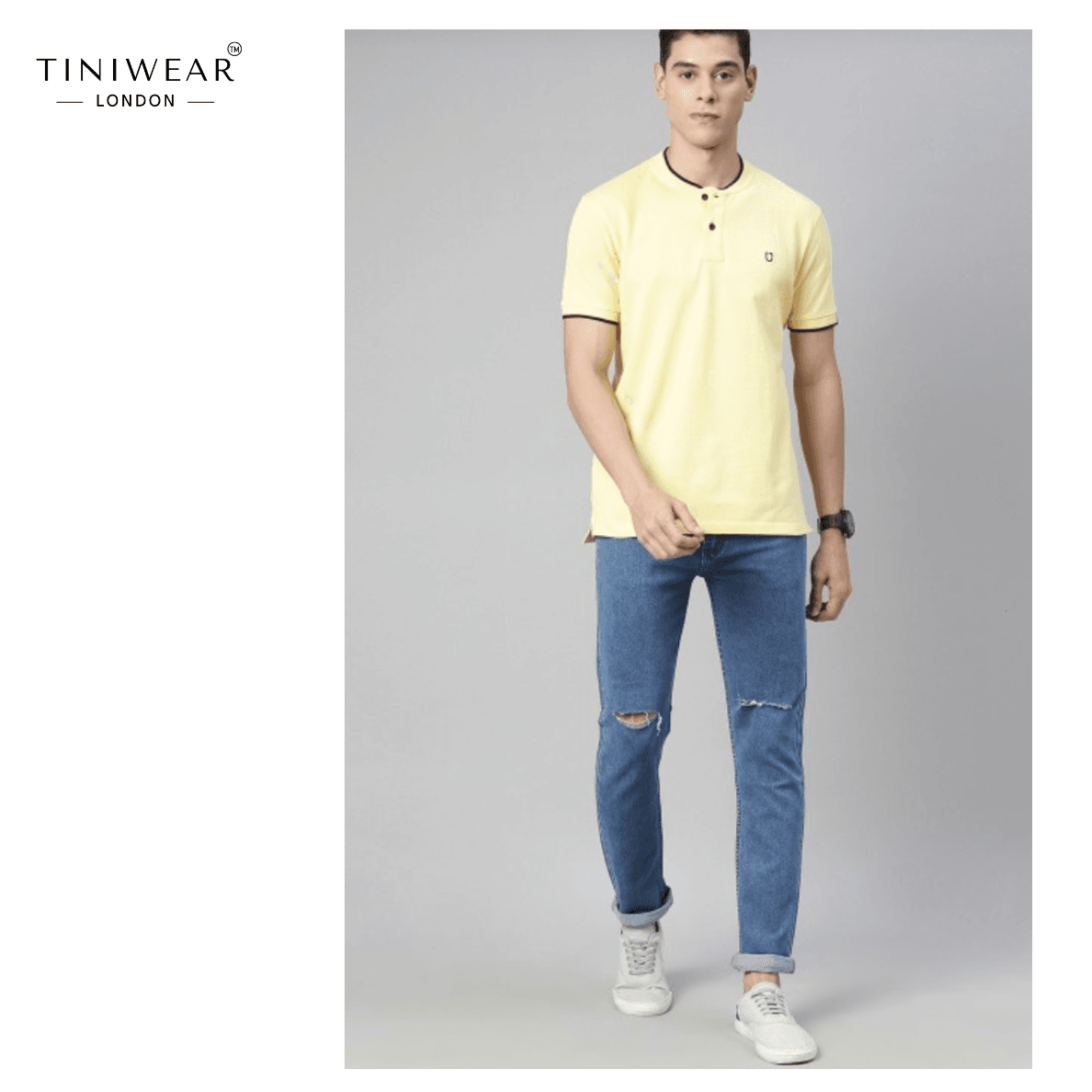 Crafted from a premium stretchable cotton blend (97% cotton, 2.5% polyester, 0.5% spandex), these Ripped Jeans offer the perfect balance of comfort, flexibility, and durability. The slim-fit, mid-rise cut flatters every body shape, while the cropped length and slash-knee detailing add the perfect urban vibe. The light fade with whisker and chevron effects gives your outfit a premium denim finish that never goes out of style. You can pair it easily with any graphic tee or streetwear top. Explore more trendy denim options from our men’s pants collection on Tiniwear to complete your look.
